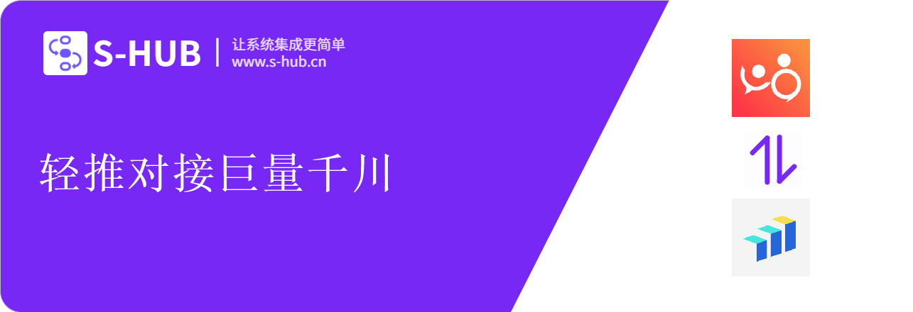 S-HUB多系统集成连接器,致力于让多系统集成变得更简单,2019年发布V1.0以来,已集成主流的钉钉、企业微信、飞书、金蝶 云·星空、用友ERP等各类系统50余个,累计服务客户100+,平均帮助企业节省60%系统集成本。